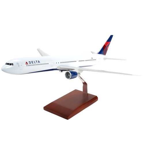 B767-400 Delta Airplane Model. B767-400 Delta Boeing is a stretched development of the popular 767-300ER, designed to replace early A300, A310 and 767 twins used on transcontinental services and DC-10-30s and L-1011 trijets used for intercontinental work. It competes with the A330-200. Compared to the 767-300, the 767-400ER's wing features 2.34m (7ft. 8in.) long raked wingtips which improve aerodynamic efficiency. Winglets were originally considered but the wingtip extensions proved more efficient. The wing is actually made from increased gauge aluminum with thicker spars. The B767-400 Delta Boeing features a 777 style advanced flight deck with six color multifunction displays, which can present information in the same format as earlier 767s, allowing a common type certificate. The all new passenger interior is similar to that in the 777. Other features include common engines with the 767-300, a new APU, new tailskid and increased weights. The 767 sold very well in from late 1980s to the late 1990s, with a decrease during the recession in the early 1990s. After strong sales in 1997, sales have declined significantly, due to the economic recession of the early 2000s, increased competition from Airbus, and the recent emergence of a direct replacement program, the Boeing 787. Boeing has kept the line open due to the KC-767 tanker program, which use the 767 airframe. The Boeing 767-400 Delta Boeing is the final extended variant that was launched in 1997 on an order for Delta Air Lines and Continental Airlines to replace their aging Lockheed L-1011 and McDonnell Douglas DC-10 fleets. Orders were also placed by Kenya Airways and ILFC but these were eventually canceled. It was again stretched 21.1 ft. for a total of 201.4 ft. It also saw a wingspan increase of 14.3 feet over the previous two variants and is the only 767 variant to also feature "raked" wingtips, which increase fuel efficiency. It was introduced into service in 2000. Dimensions: 24"L x 8"W x 6.82"